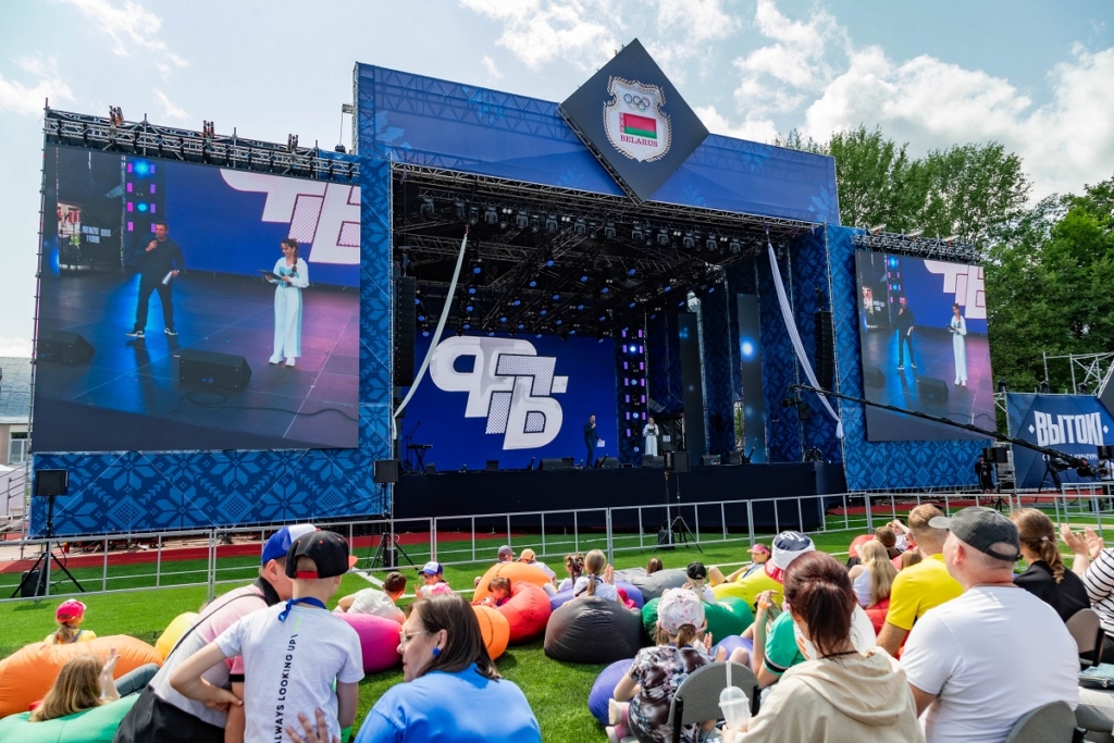 Возле главной сцены на стадионе ФСК зрители могли потанцевать под известные мировые композиции в ходе шоу «Музыкальный ринг». Вечером эстафету праздника подхватит гала-концерт с участием звезд белорусской эстрады. Финал спортивного семейного праздника тоже обещает быть ярким: небо украсит фейерверк над водой и пройдет дискотека.