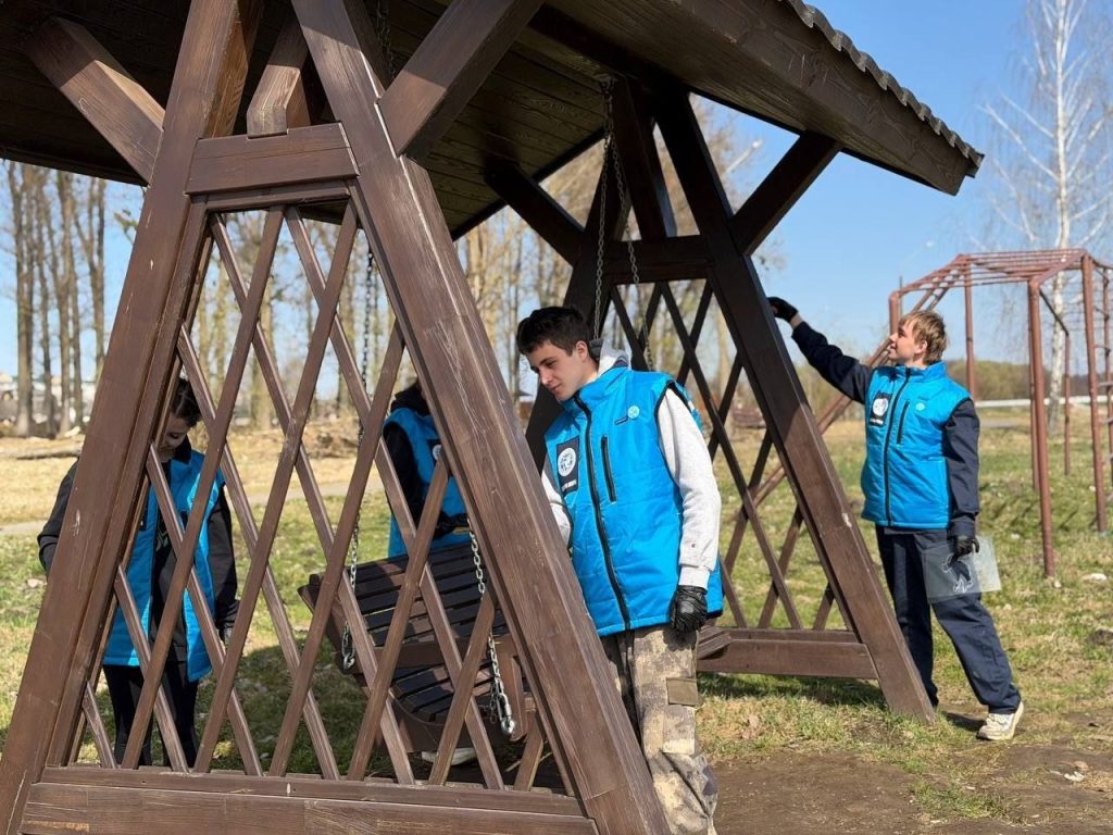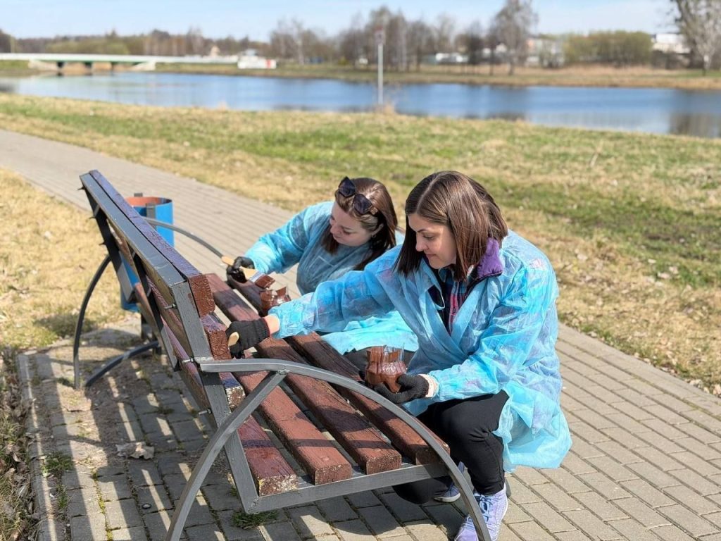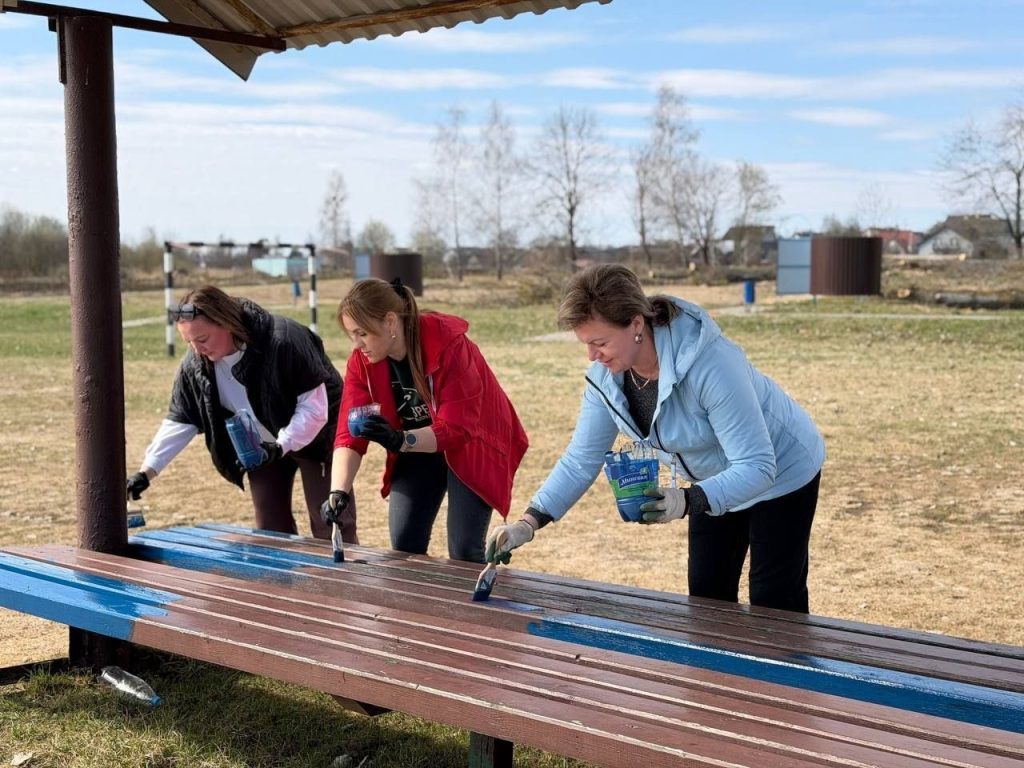 Здесь не просто красили скамьи и качели, а наносили на них символы наших объединкний как знак того, что общественные организации всегда рядом и заботятся о комфорте.
