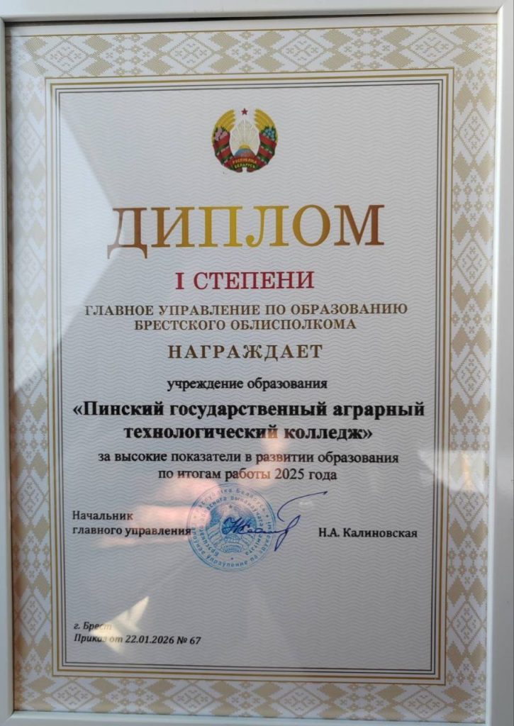 ДИПЛОМОМ I степени  награждён Пинский государственный аграрный технологический колледж!